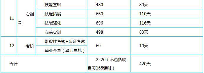 1、在校實際學習天數(shù)420天(節(jié)假日除外),專業(yè)教學合計2520課時,機動課時±5%