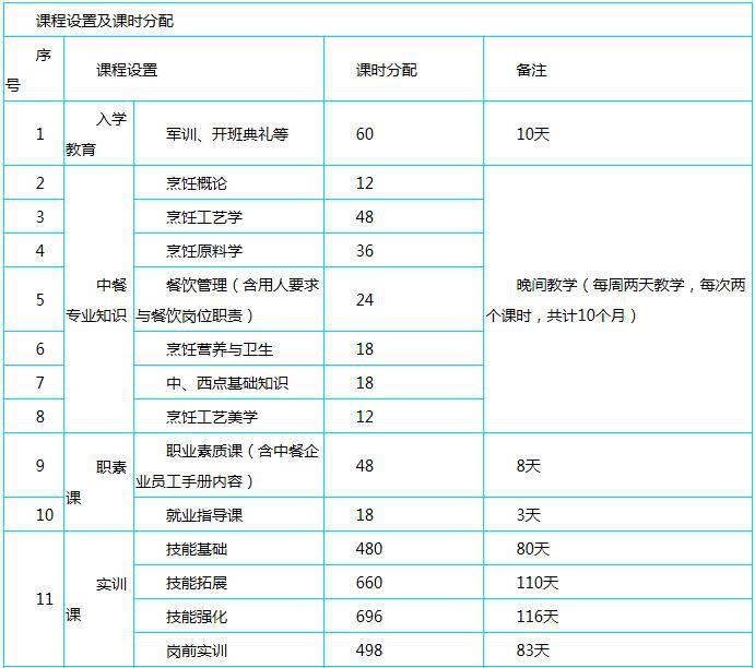 (1)總課時2688課時中包含(入學教育+中餐專業(yè)知識+職素課+實訓課+考核);中餐專業(yè)知識為理論課,要求每周上2個晚自習,每晚自習2節(jié)課。(金牌專業(yè)理論課程晚上上課)
