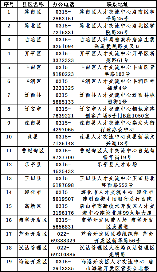 附:唐山市各縣區(qū)人才中心聯(lián)系方式
