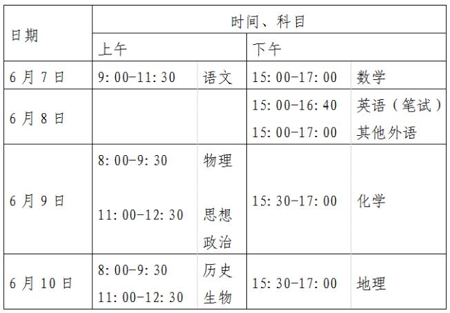 2020年高考時間,共計4天。6月7-8日統(tǒng)一高考,考試科目為語文、數(shù)學(xué)、外語3門科目,每科滿分150分;6月9-10日高中學(xué)業(yè)水平等級性考試,考試科目為思想政治、歷史、地理、物理、化學(xué)、生物6門,考生自主選擇3門。