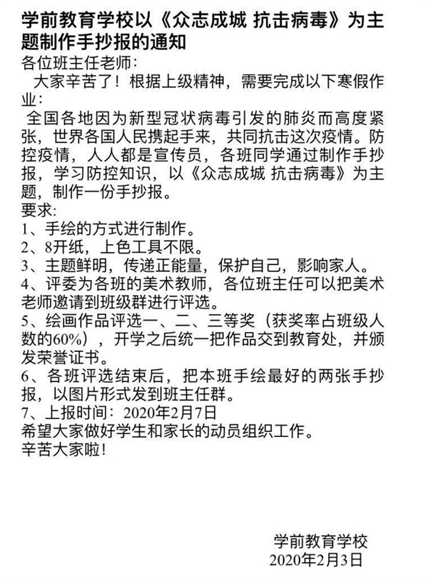 活動伊始,石家莊市學(xué)前教育中等專業(yè)學(xué)校通過班級微信群、QQ群向同學(xué)們發(fā)出號召,希望同學(xué)們以繪制手抄報形式為武漢加油,為抗疫助力,了解疫情,增強(qiáng)信心,學(xué)會責(zé)任與擔(dān)當(dāng)。