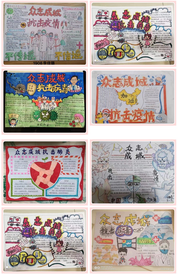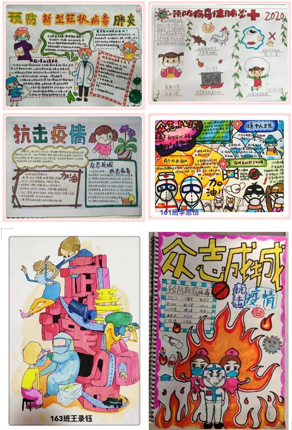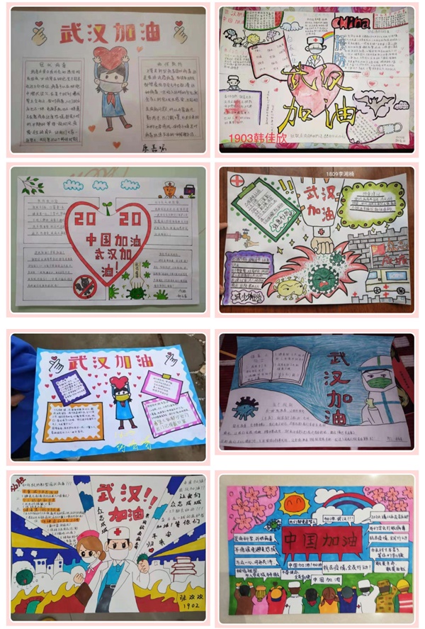 在活動中,班主任認(rèn)真落實,美術(shù)老師大力支持,同學(xué)們積極響應(yīng),“中國加油!武漢加油!“抗擊疫情,我們在一起”“眾志成城 抗擊病毒”“防護(hù)疫情,從我做起”一件件作品誕生了。
