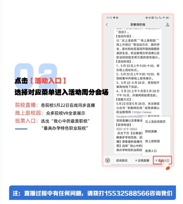 2021年5月22日上午9點正式開啟由唐山市教育局等九部門協(xié)同組織,依托唐山職業(yè)教育網(wǎng)、職教網(wǎng)在線公眾號舉辦“云上活動周”。其中包括院校直播、“線上逛校園”、網(wǎng)絡評選等多種活動。