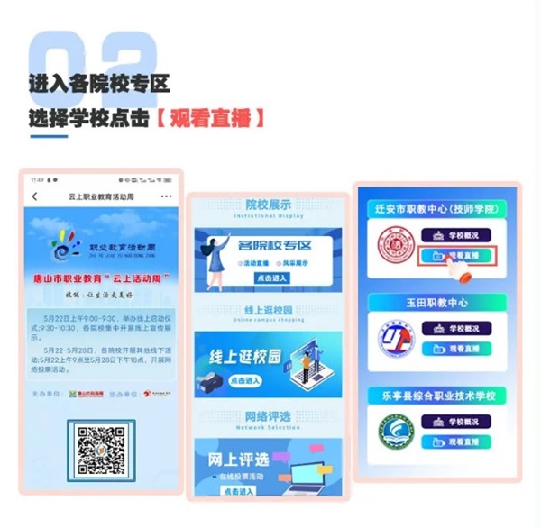 此次“云上活動周”,積極滿足學生、家長了解職業(yè)學校、明晰職教政策的多項需求,并實時開展“職教唐山 精彩在冀”網(wǎng)絡評選,分別設立“我心中的最美職!薄白罹咿k學特色職業(yè)院!痹u選各3所,最終投票結果將在唐山職業(yè)教育網(wǎng)公布。