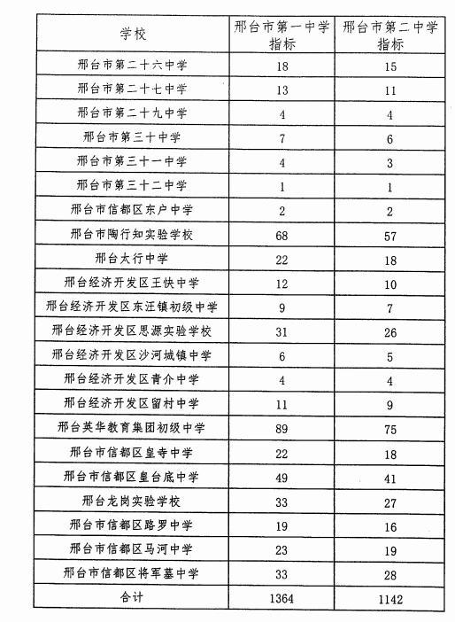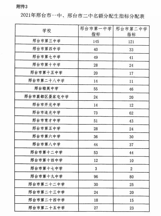 2021邢臺市一中、邢臺市二中名額分配生指標分配表