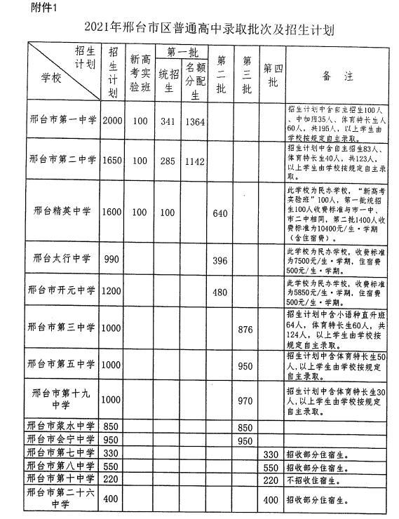 2021邢臺市區(qū)普通高中錄取批次及招生計劃