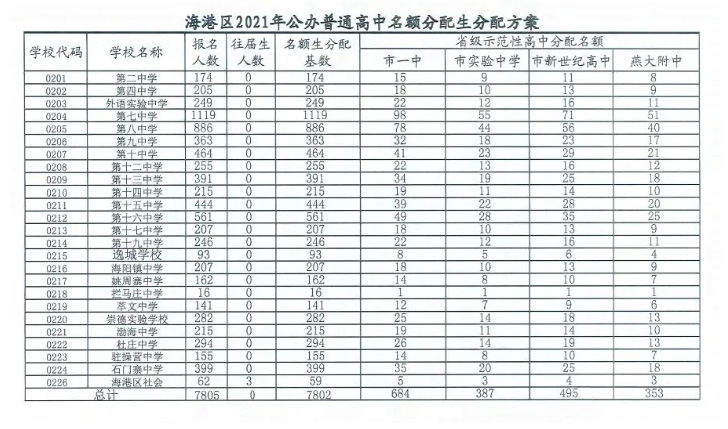 2021年河北秦皇島海港區(qū)普高名額分配招生計劃