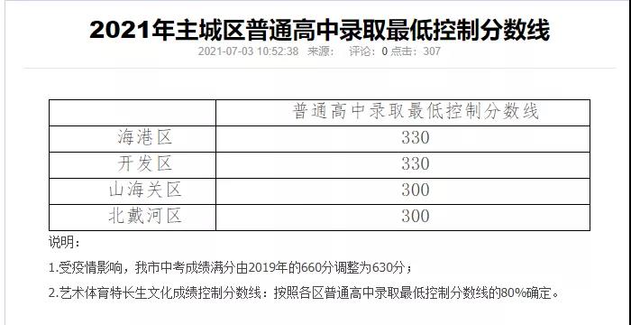 2021年秦皇島主城區(qū)普通高中錄取控制分數(shù)線