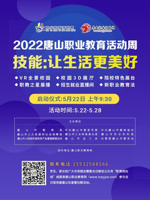 為深入學(xué)習(xí)貫徹習(xí)近平總書記關(guān)于職業(yè)教育的重要指示精神和全國職業(yè)教育大會精神,讓更多家長與學(xué)生真正了解職業(yè)教育的深刻含義,感受職業(yè)教育發(fā)展為生活帶來的諸多便利,展示我市職業(yè)教育改革發(fā)展取得的成就,多層次、多角度了解職業(yè)學(xué)校辦學(xué)成果及辦學(xué)風(fēng)采,唐山市教育局等九部門協(xié)同組織開展2022年唐山職業(yè)教育活動周,活動周將于5月22日上午9:30正式啟動!