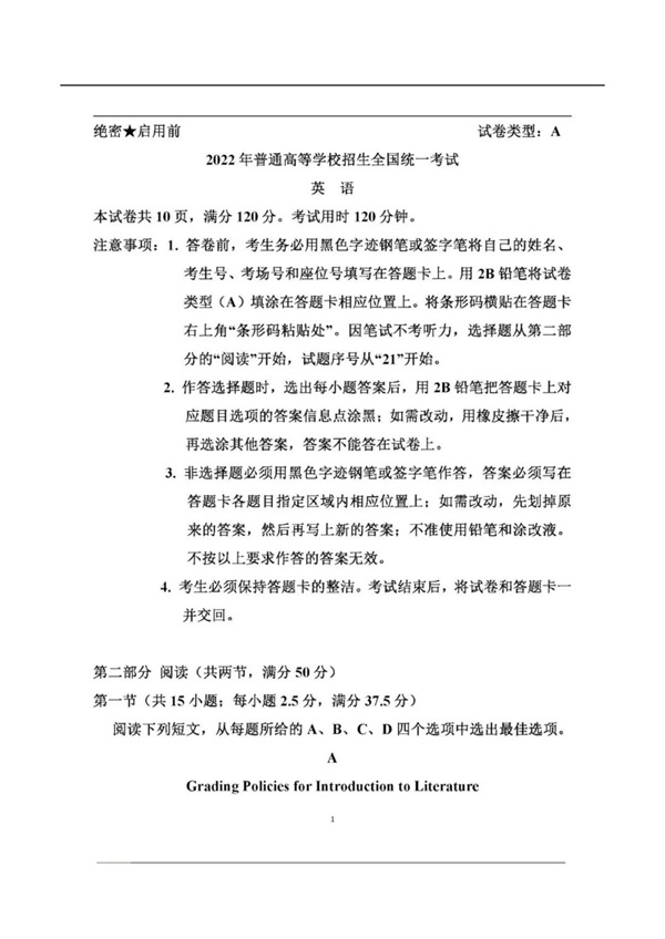2022年全國(guó)高考英語(yǔ)試卷(新高考I卷)答案及解析