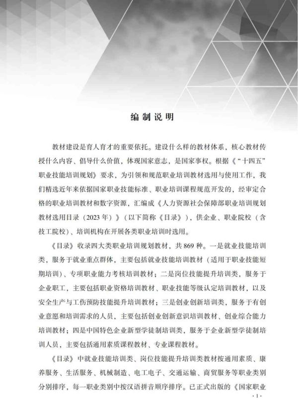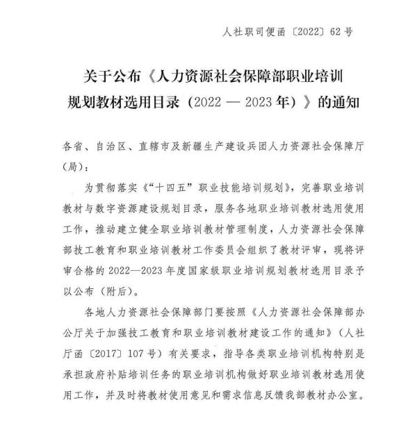 根據(jù)《“十四五”職業(yè)技能培訓(xùn)規(guī)劃》要求,為引領(lǐng)和規(guī)范職業(yè)培訓(xùn)教材選用與使用工作,人力資源社會保障部技工教育和職業(yè)培訓(xùn)教材工作委員會辦公室精選近年來依據(jù)國家職業(yè)技能標(biāo)準(zhǔn)、職業(yè)培訓(xùn)課程規(guī)范開發(fā)的,經(jīng)審定合格的職業(yè)培訓(xùn)教材和數(shù)字資源,匯編成《人力資源社會保障部職業(yè)培訓(xùn)規(guī)劃教材選用目錄(2023年)》(以下簡稱《目錄》),供企業(yè)、職業(yè)院校(含技工院校)、培訓(xùn)機(jī)構(gòu)在開展各類職業(yè)培訓(xùn)時(shí)選用。