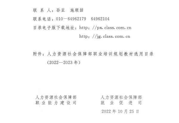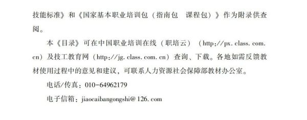 本《目錄》可在中國職業(yè)培訓(xùn)在線(職培云) (http:/ / px. class. com.cn)及技工教育網(wǎng)(http:/ / jg. class. com. cn)查詢、下載。各地如需反饋教材使用過程中的意見和建議,可聯(lián)系人力資源社會保障部教材辦公室。