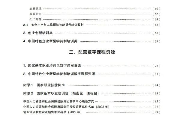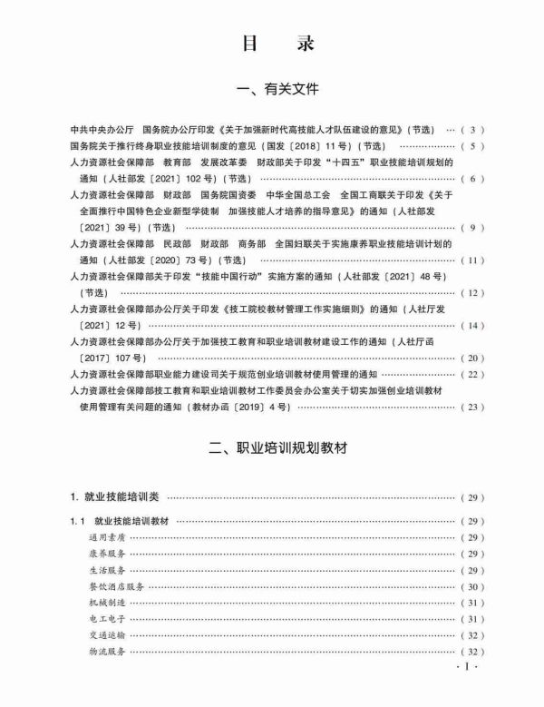 《目錄》中就業(yè)技能培訓(xùn)類、崗位技能提升培訓(xùn)類教材按通用素質(zhì)、康養(yǎng)服務(wù)、生活服務(wù)、機(jī)械制造、電工電子、交通運(yùn)輸、商貿(mào)服務(wù)等職業(yè)類別分別排序,每一職業(yè)類別中按漢語拼音順序排序。已正式出版的《國家職業(yè)技能標(biāo)準(zhǔn)》和《國家基本職業(yè)培訓(xùn)包(指南包 課程包)》作為附錄供查閱。