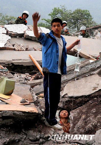 李陽曾是北川中學(xué)的學(xué)生。汶川大地震發(fā)生時,李陽躲過一劫。一名叫廖波的學(xué)生因埋得較深,不能立即救出來,醫(yī)務(wù)人員給他輸液,然后又去救護其他的人。李陽守候在一旁,為廖波托起輸液瓶,并一直鼓勵他。這個畫面被定格在鏡頭里,感動了許多人,李陽因此被稱為“吊瓶男孩”。