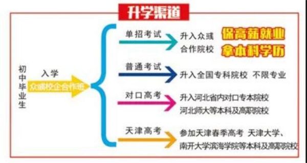 采取3+2+1形式,中專三年級參加河北省內(nèi)單招,可進入河北省內(nèi)大專院校,若進入同企業(yè)合作的國辦大專相應(yīng)院校,幫助高薪就業(yè),且大專畢業(yè)后有機會獲得國辦本科院校的成教本科學(xué)歷。