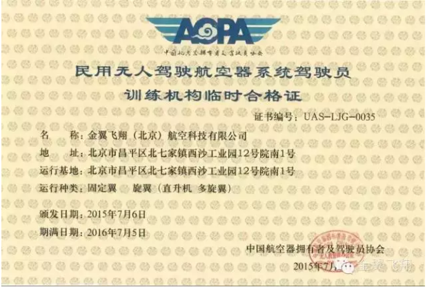 所有培訓(xùn)接受后,舉行理論和實(shí)踐考試,考試合格者將頒發(fā)中國(guó)民航局下屬AOPA協(xié)會(huì)頒發(fā)的AOPA民用無人駕駛航空器系統(tǒng)駕駛員、機(jī)長(zhǎng)結(jié)業(yè)證書及民用無人機(jī)駕駛航空器系統(tǒng)駕駛員、機(jī)長(zhǎng)合格證。
