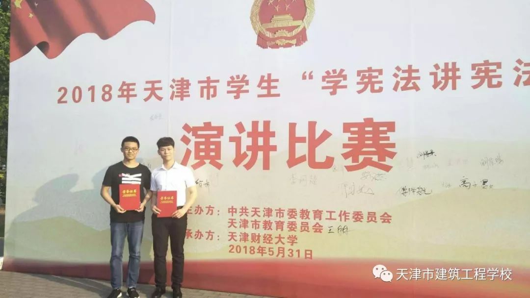 2018年5月31號,在天津財經(jīng)大學舉辦了天津市學生“學憲法講憲法”的演講比賽。這次比賽的主辦方是中共天津市委教育工作委員會、天津市教育委員會,由財經(jīng)大學、河北工業(yè)大學、天津師范大學、南開大學這四所學校的老師擔任專家評委。大賽共分為小學組,初中組,高中(中職)組,高校組共4個組別。天津市建筑工程學校學子也參與了此次活動。