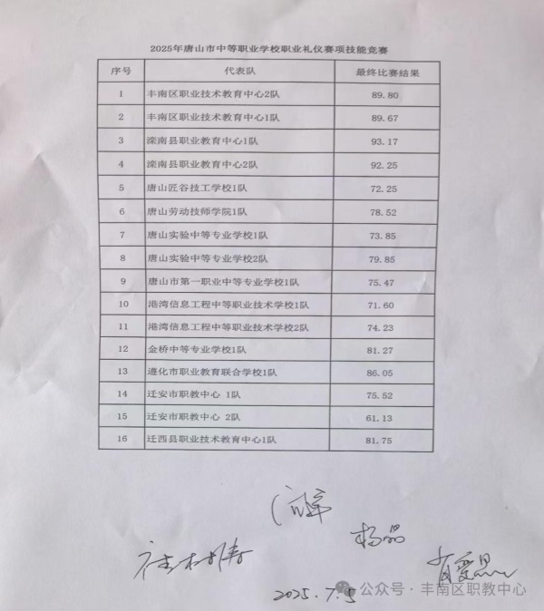 2025年7月5日,唐山市技能大賽職業(yè)禮儀賽項在灤南職教中心舉辦,在主管校長田明同志與現(xiàn)代服務(wù)專業(yè)部王曉全主任的大力支持下,豐南職教中心邢慧琛、么依彤兩位指導(dǎo)教師帶領(lǐng)幼兒保育專業(yè)—1隊:李思彤、劉思辰、劉禹彤、崔靜茹、田鑫語、高晗瑞,2隊畢桐雨、畢渃伊、王雪伊、常可芯、陳爍帆、劉思宇十二名學(xué)生分為兩組在全市16個代表隊,96名選手參賽中取得優(yōu)異成績,紛紛榮獲二等獎。